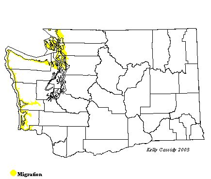 Whimbrels are seen in Washington mostly during migration, but there are a few winter records from the coast. Some non-breeding birds summer on the coast as well. Migrating birds start coming through the Washington outer coast and Puget Sound in early April, are common from mid-April through mid-May, and then taper off through the end of May. The southward migration starts in late June, and they are common on the coast through mid-August. After this, they taper off and are uncommon until the end of October. In eastern Washington, migrating Whimbrels are fairly rare, but can be seen from mid-April to early June, and then again from late June through the end of August. They are more likely to be seen on the trip north than on the trip south. In western Washington, they are more common in spring in the protected waters of Puget Sound and the Strait of Juan de Fuca. Fall migrants are more likely to be found in coastal estuaries such as Grays Harbor (Grays Harbor County) and Willapa Bay (Pacific County), although they do occur along inland marine waters as well.